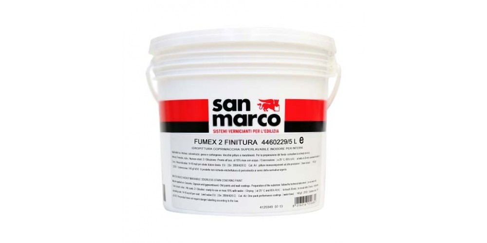 FUMEX 2 FINITURA este o vopsea diluabila in apa pentru interioare, cu aspect opac catifelat, formulata special pentru completarea sistemului FUMEX 1 PRIMER/FUMEX 2 FINITURA, indicata pentru vopsirea zidurilor cu pete de: nicotina, cafea, grasimi alimentare (ulei prajit), vin, carioca, cerneala, funingine, etc.